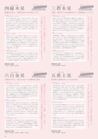三碧木星さんぺきもくせい太陽と一緒に昇りつめる運気をもち、出世街道まっしぐら!!何をやっても思うように物事が進まない運勢にあり、体調面、対人関係、恋愛、事故など、さまざまなトラブルが起きやすい時です。トラブル続きで自暴自棄になってしまいがちですが、こういう時期だからこそ後のことを見据えて、自分のためになるものを身に付けていきましょう。三碧木星のあなたにとって2013年は停滞期にあたります。人のために何かをしたり、慎重な行動をとることにより、2014年以降に良い運気を呼ぶことになります。今年は試練の年と割り切って、自らの土台作りに励むようにしましょう。不倫や略奪愛、二股愛など、人にはなかなか言えないような恋愛に陥ってしまうことも。男性に出会う機会はあるものの、あまり良い相手と巡り会えません。出会ったとしても騙されてしまったり、女性関係にだらしないといった男性である確率が高いです。全体運同様、恋愛運もまた停滞する時期。今まで順風満帆だったとしても、トラブルに見舞われやすくなるでしょう。まったく予想していなかった突然の破局、恋人の裏切りなどにあう可能性が高くなります。恋愛もまた慎重さと、冷静な判断が必要となります。気安く使っていると、お金は減るばかりです。気を引き締めていないと、詐欺や悪徳商法などに騙されてしまう…といったことも起こりかねません。2013年は金運も低迷するので、いつも以上に慎重にお金を使う必要があるでしょう。できるだけ無駄遣いをせず、2014年に向けて貯蓄を心がけるようにしましょう。-恋愛運-Love-金運-Money人のために何かをしたり、慎重な行動をとることにより、2014年以降に良い運気を呼ぶことになります。【相性の良い九星】一白水星・四緑木星・九紫火星四緑木星しろくもくせい協調性を持ち、周囲を和ませる気配り上手2013年は自分自身のことをしっかりと見つめなおし、徐々に上昇していく運気に向けて準備をしておきましょう。コツコツと努力を重ねておくことで、来年につながっていきます。ただ、理想だけを追い求めたり、やりたいことだけをやるのではいけません。2013年前半はまだ低迷していますが、後半に向けて運気は上昇していきます。色々なことに対し敏感にアンテナを張り、その選択にしっかりと努力を重ねていきましょう。来年以降、その努力が実ることになります。言葉やコミュニケーションが重要。言葉やコミュニケーションを上手に活かせれば、恋愛運もアップし、願いを叶えることができます。ですから言葉遣いや人との接し方には、特に注意するようにしましょう。四緑木星のあなたの場合、どっしりと構えることが2013年の恋愛運を呼び込むことに。結婚を考えている、告白を考えている…といった状況なのであれば、焦らずじっくりと行動するようにしましょう。自らが積極的にコミュニケーションを取ることで、良い結果に繋がっていきます。本格的に運気が上昇する来年に向けてしっかりと貯蓄をしておきましょう。大きな買い物や投資をしたくなることもありますが、2013年はまだ動く時期ではないので我慢を。2013年の金運は、後半にかけて徐々にアップしていきます。交際費に出費がかさみそうですが、人脈の拡大や情報収集が、金運上昇を後押しするでしょう。-恋愛運-Love-金運-Money色々なことに対し敏感にアンテナを張り、その選択にしっかりと努力を重ねていきましょう。【相性の良い九星】一白水星・三碧木星・九紫火星五黄土星ごおうどせい親分肌で面倒見がよい中心的存在2013年は今までの雰囲気からイメージチェンジをすることにより、さらに運気を上昇させることができます。良縁に恵まれるようになるので、出会いを求めている人は、婚活やパーティー、サークルなど、積極的に参加してみると良いでしょう。ただし、出会いに恵まれるからといって、二股をかけたりするのは厳禁です。運気を逃してしまいます。また2013年は、復活愛の可能性も高いです。計画的にお金を使えるのであれば、良い運気に乗ることができます。金運も、ようやく上昇。今まで金運が良くなかったという五黄土星のあなたにも、2013年はツキが訪れます。新規事業を起こすのにも向いている年です。低迷期に貯蓄をし、準備をしてきたのであれば、思い切った投資をしてみるのも良いでしょう。-恋愛運-Love-金運-Money2013年は長く続いていた運気の低迷期からようやく抜け出せる幸先の良い年になるでしょう。【相性の良い九星】一白水星・四緑木星・九紫火星運気自体は上昇しますが、良くも悪くも自らとってきた行動がそのまま表れがち。行動、言動、すべてに於いて、誠実な態度を取ることで運を呼ぶことになります。2013年は長く続いていた運気の低迷期からようやく抜け出せる幸先の良い年になるでしょう。低迷期にコツコツと努力を重ねてきた人は、その努力が認められる良い運勢にあります。仕事の成功や、人間関係など、幸運に恵まれ